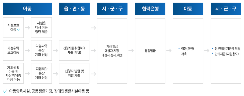 기초생활수급 및 차상위계층가정 아동 > 디딤씨앗 통장 계좌 신청 > 읍,면,동 - 신청자를 발굴 및 취합 제출 > 시,군,구 - 계좌발급 대상자 지정,대상자 심사,확정 > 협력은행 - 통장발급 > 아동(후원)저축 > 시,군,구 - 정부매칭 지원금 적립,만기지급(자립용도)
