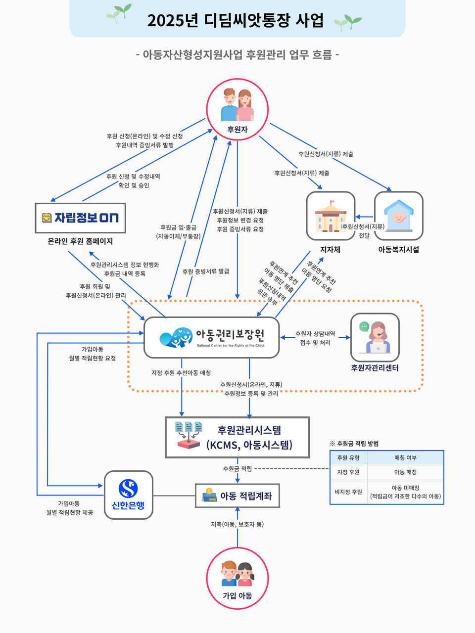 시설보호아동 > 시설은 대상 아동 명단 제출 > 시,군,구 - 계좌발급 대상자 지정,대상자 심사,확정 > 협력은행 - 통장발급 > 아동(후원)저축 > 시,군,구 - 정부매칭 지원금 적립,만기지급(자립용도)
