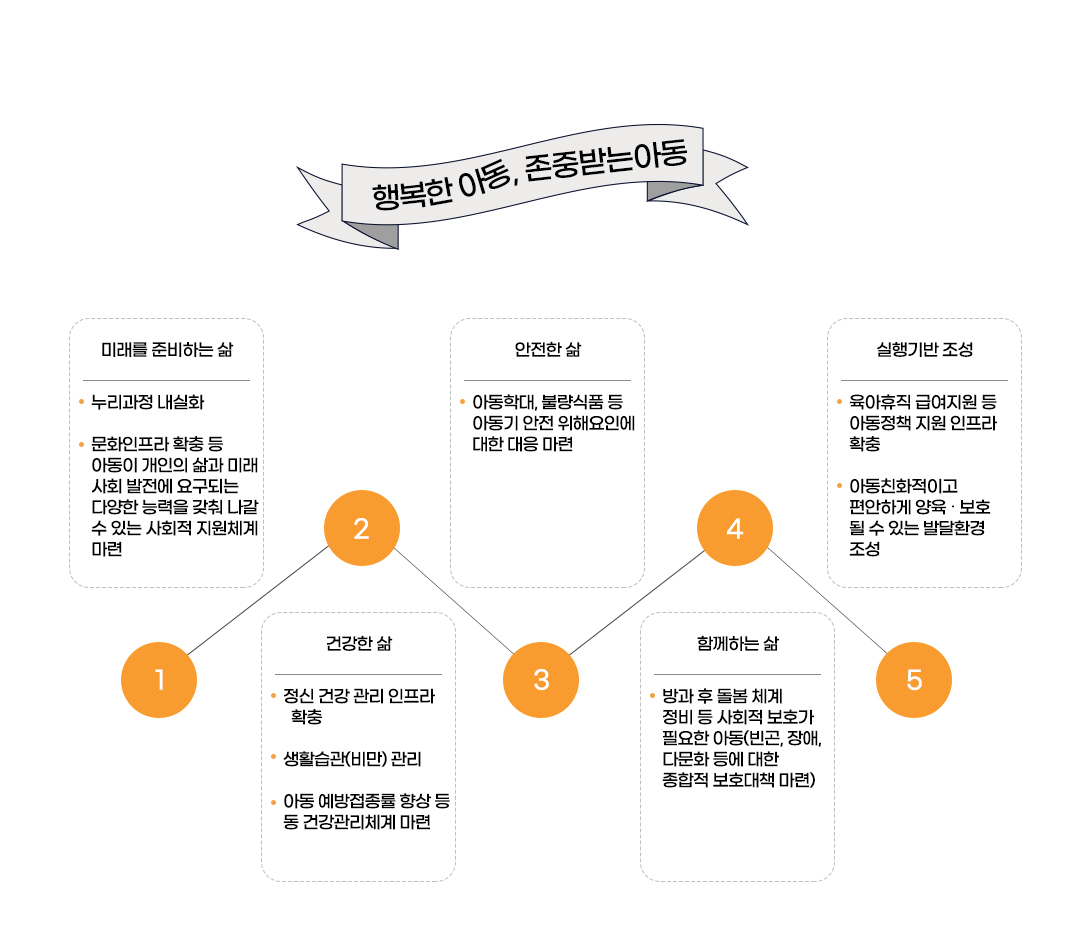 • 5. 실행기반 조성: 육아휴직 급여지원 등 아동정책 지원 인프라 확충, 아동친화적이고 편안하게 양육〮보호될 수 있는 발달환경 조성