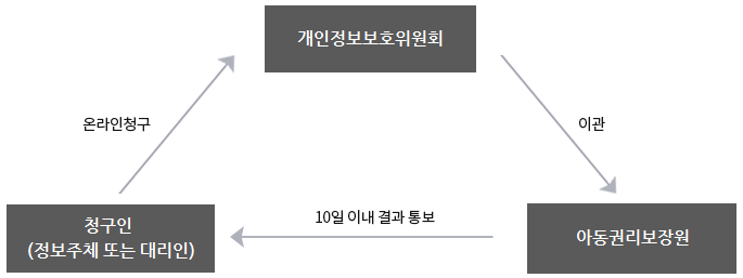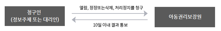 • ① 아동권리보장원이 보유하고 있는 개인정보는 개인정보보호법 및 관련법령이 정하는 바에 따라 본인에 한하여 열람, 정정·삭제, 처리정지를 청구할 수 있습니다. 만 14세 미만 아동에 관한 개인정보의 열람등 요구는 법정대리인이 직접 해야 하며, 만 14세 이상의 미성년자인 정보주체는 정보주체의 개인정보에 관하여 미성년자 본인이 권리를 행사하거나 법정대리인을 통하여 권리를 행사할 수도 있습니다.