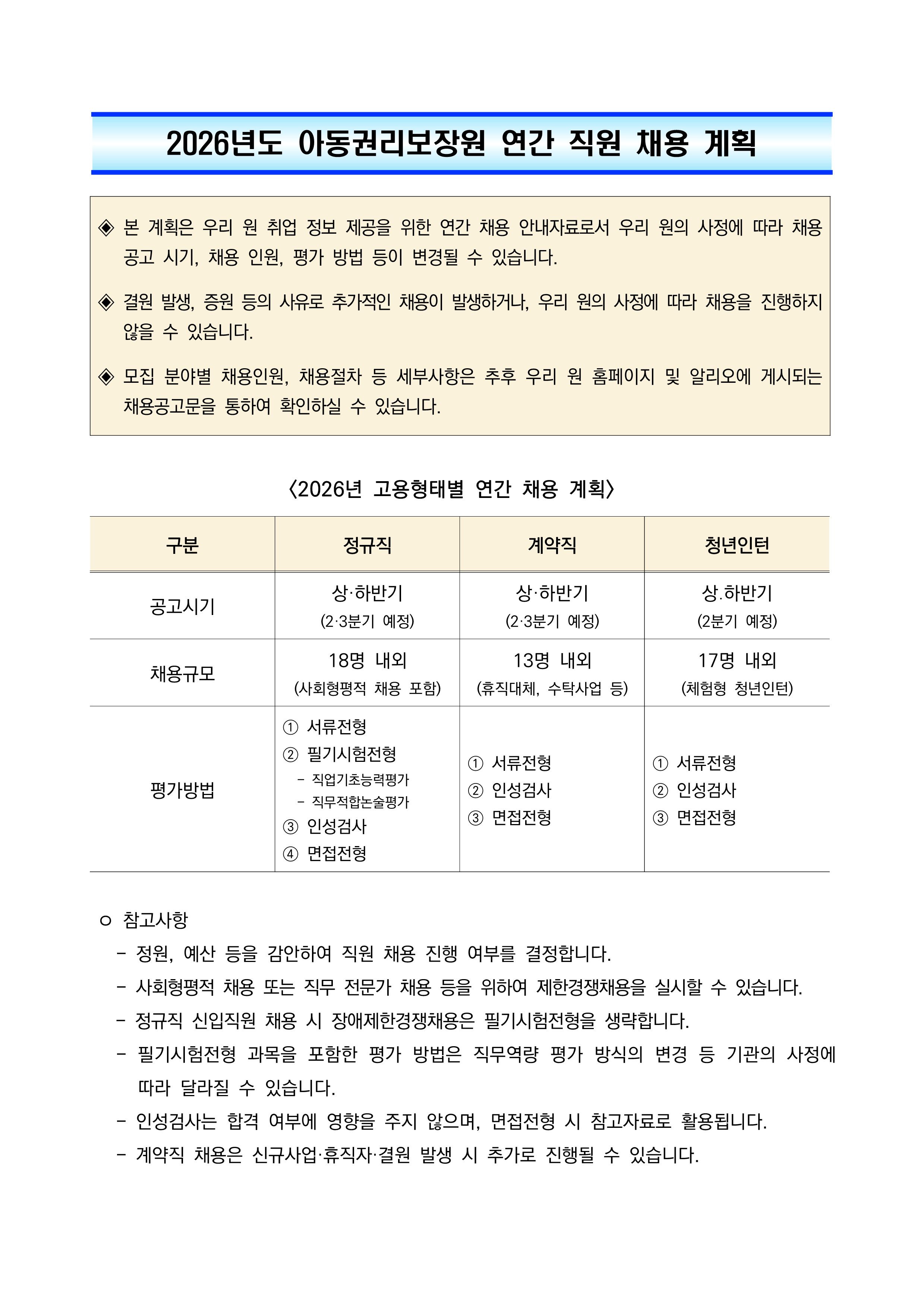 2026년도 아동권리보장원 연간 직원 채용 계획 안내